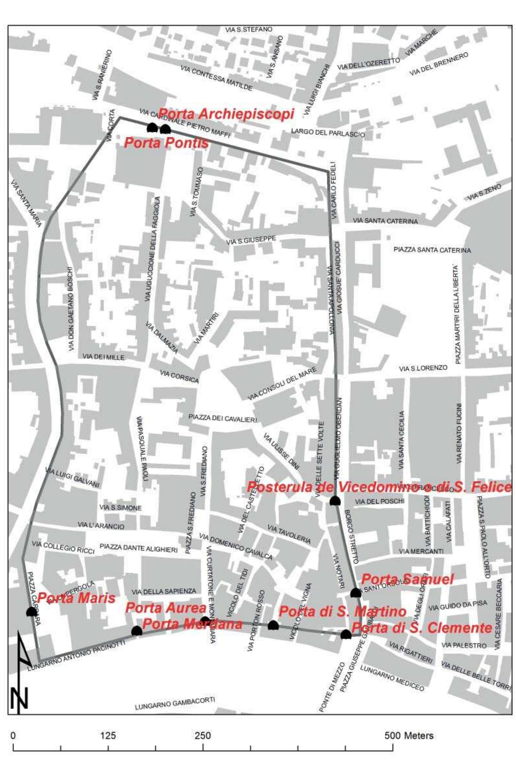 The third and last chapter is divided into two parts. The first part will illustrate the great urban transformations throughout the period ranging from the end of the Roman Age (VI century) to the Florentine conquest (start of the XV century). Although it is still difficult to have a clear picture of the Roman and early-medieval urban design of Pisa, it is nevertheless possible to understand some of its nodal points, to interpret the city’s development during the middle years of the Middle Ages and to analyse what happened during the transition that led to the modern city. The second part will deal with the material traces, i.e. the archaeological sources that allowed us to recover pieces of history and build the overall picture. Excavation data will provide information about the buildings, roads, workshops and craft laboratories, waste disposal and water supply systems, and on the wealth and social status of the city’s inhabitants.